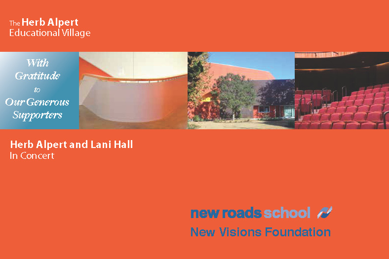 Santa Monica, California — Herb Alpert and Lani Hall will entertain invited friends and supporters of The Herb Alpert Educational Village on Sunday, March 24th at 2pm. Performing in the new Ann and Jerry Moss Theater the Alperts will play songs from their next album “Steppin Out,” to be released in the spring. The Sunday program will include a jazz set and songbook favorites such as “Puttin’ on the Ritz,” “Moondance,” “La Vie en Rose,” “Besame Mucho,” a Carlos Jobin song medley and Tijuana Brass favorites. Located in the heart of the City of Santa Monica’s mixed–use creative district, The Herb Alpert Educational Village is home to New Roads School, the New Visions Foundation and other non–profit organizations working in the fields of education, the arts, the environment, and social justice. The goal of The Herb Alpert Educational Village founders and supporters is to create a new model for innovative, collaborative, and inclusive education. In addition to providing office space for the non–profit partners, and specialty classroom space for New Roads School, the new green facility houses the 344–seat state–of–the–art Ann and Jerry Moss Theater, the Capshaw-Spielberg Center for Arts and Educational Justice and a 2,000–square–foot community forum. These spaces allow for enhanced programming at New Roads School and provide a resource for the entire community. “We are deeply grateful to the individuals, families and foundations whose collective spirit of giving and passion for innovative and open education has helped bring to life our vision for The Herb Alpert Educational Village. Our afternoon of music with Herb and Lani promises to be an unforgettable celebration for our community, and is one more example of the visions and gracious generosity of Herb and Lani,” says New Visions founder and CEO, Paul Cummins. Herb Alpert and Lani Hall Alpert are known for their transformative, arts and education–focused philanthropy, as well as their prominent place in musical history. “With their leadership and the support of so many of our families and friends, we at New Roads have been able to remain true to our founding mission of providing quality college preparatory education to a diverse student body, and to pursue our mission in new ways, benefiting from the spectacular new facility that we have just completed,” says President and Head of School, David Bryan. About New Roads School About New Visions Foundation About Herb Alpert Nancy London |